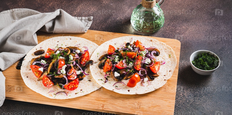 Вкусные тако с жареными грибами, помидорами, луком и сыром фета на веб-баннере
