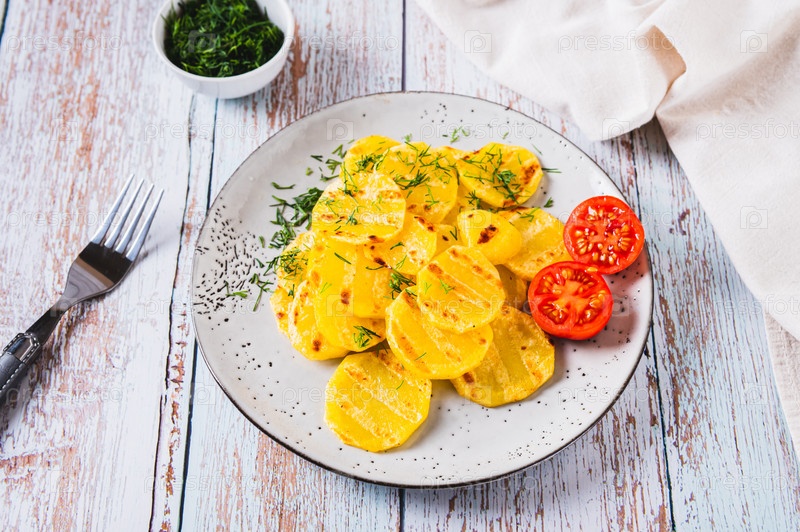 Золотистые ломтики жареного картофеля с травами на тарелке на столе