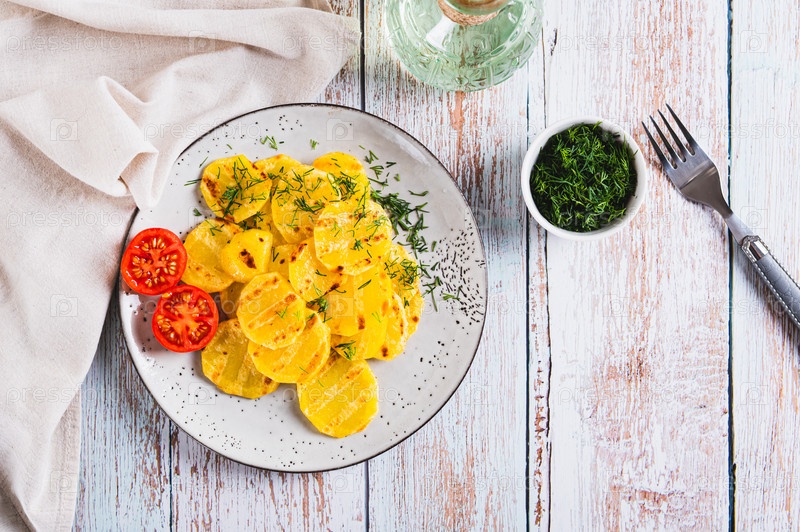 Аппетитный жареный картофель с помидорами и укропом на тарелке на столешнице