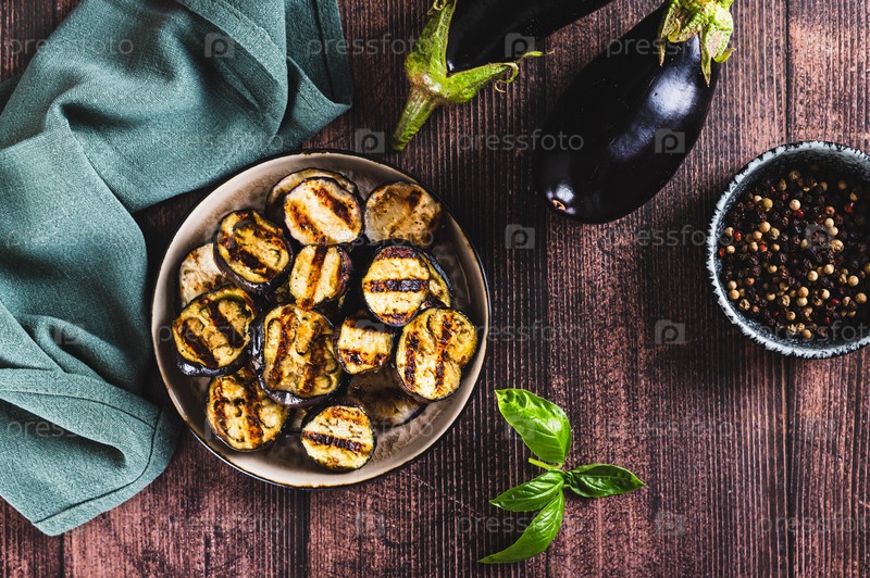 Аппетитные острые кусочки баклажана на гриле на тарелке на столешнице