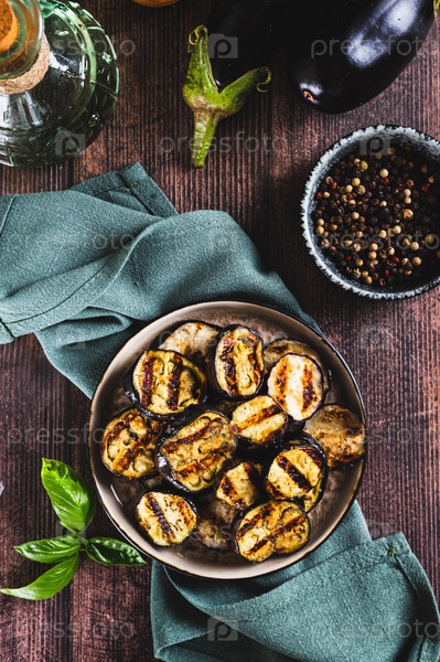 Вкусные кусочки жареных баклажанов на тарелке на столешнице и вертикальный вид