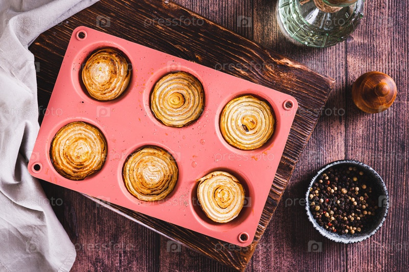 Карамелизированные половинки печеного лука в форме для выпечки на столешнице