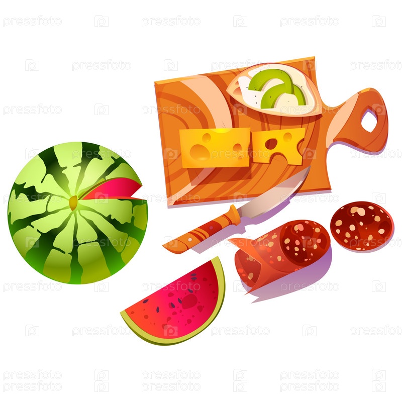 Сытный завтрак, нарезанная колбаса, сыр и арбуз на десерт