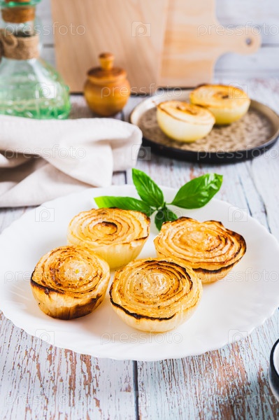 Карамелизированный жареный лук и базилик на тарелке на столе вертикальный вид