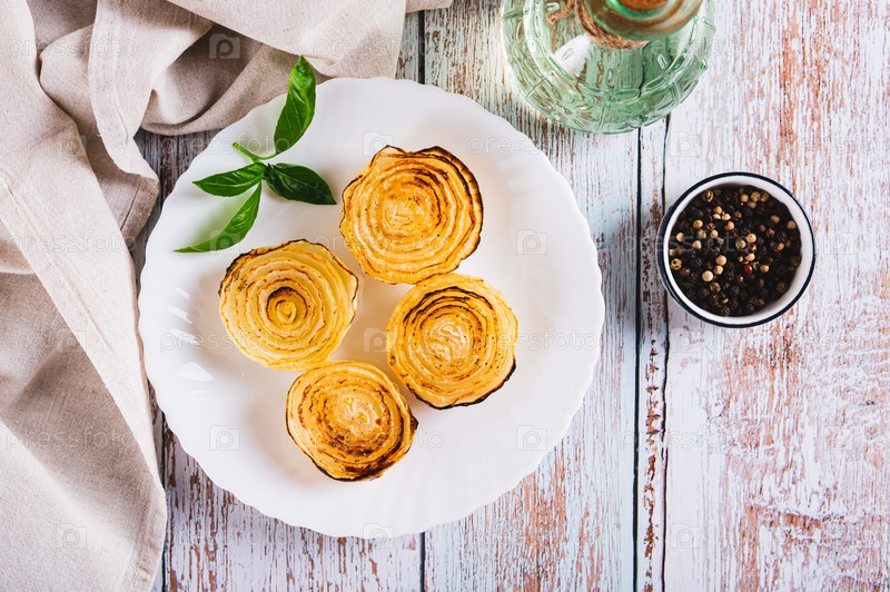 Карамелизированный жареный лук и базилик на тарелке на столешнице