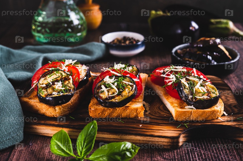 Жареные тосты с жареными баклажанами, помидорами и сыром на доске на столе