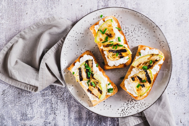 Крупный план сэндвичей с рикоттой, жареными цуккини и зеленым луком на тарелке, вид сверху