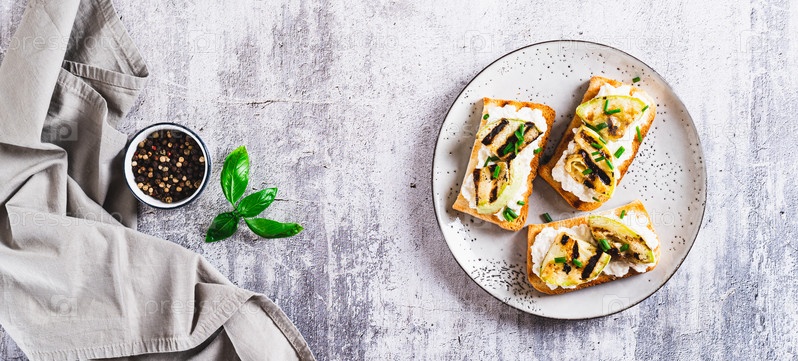 Вкусная брускетта с рикоттой, жареными цуккини и зеленью на тарелке вид сверху веб-баннер