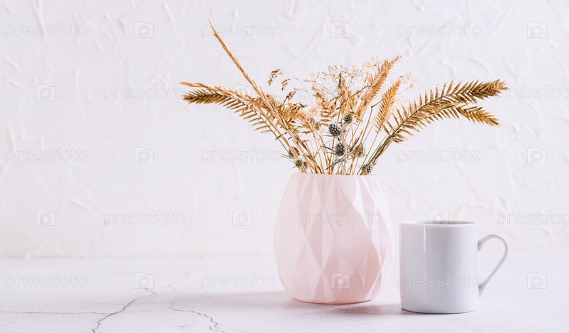 Фигурная ваза с сухоцветами и чашкой кофе на белом фоне