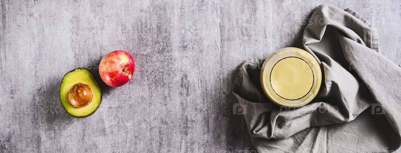 Органический смешанный напиток из авокадо, яблока и йогурта в стакане на столешнице веб-баннер