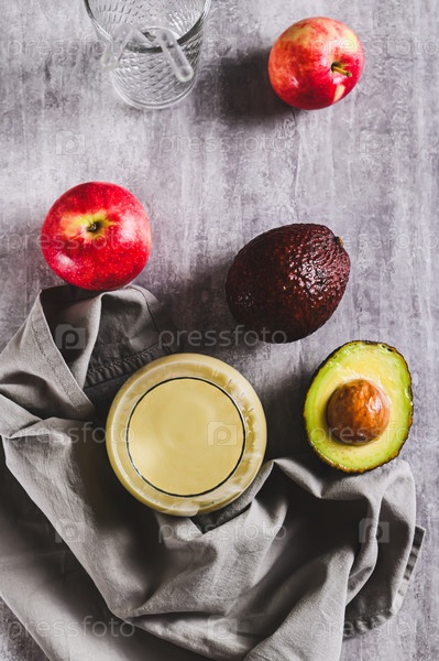 Органический смешанный напиток из авокадо, яблока и йогурта в стакане на столешнице и вертикальный вид