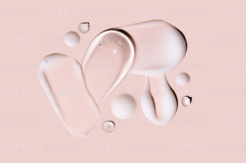 Успокаивающий крем-лосьон увлажняющий гель мазки на бежевом фоне. Средства по уходу за кожей и телом. Жидкие гелевые косметические пятна