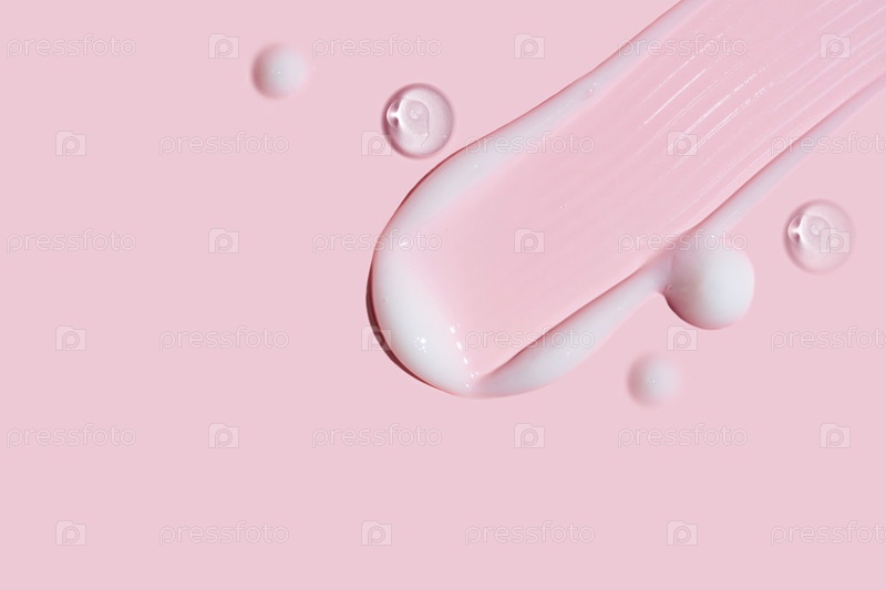 Белый крем и прозрачная гелевая текстура на розовом фоне. Средства по уходу за кожей размазывают