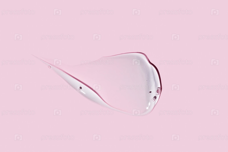 Текстура геля глицерина. Прозрачный мазок сыворотки на розовом фоне. Жидкий гель-увлажнитель с пузырьками макро