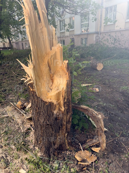 Упавшее дерево лежит в городе летом