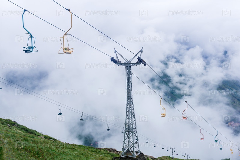 Кресельная канатная дорога над склоном горы в пасмурную погоду