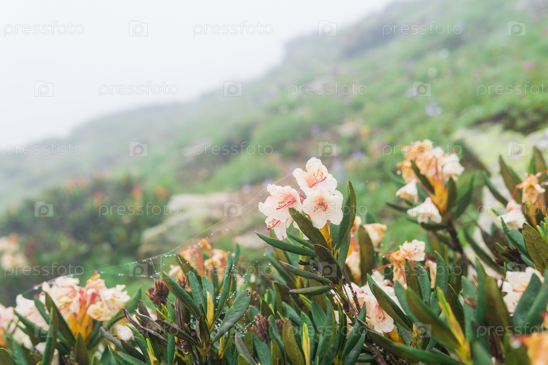 Цветущий кавказский рододендрон на склоне горы внутри облака