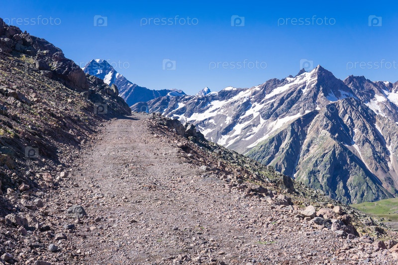 Каменистая грунтовая дорога через перевал в горной местности