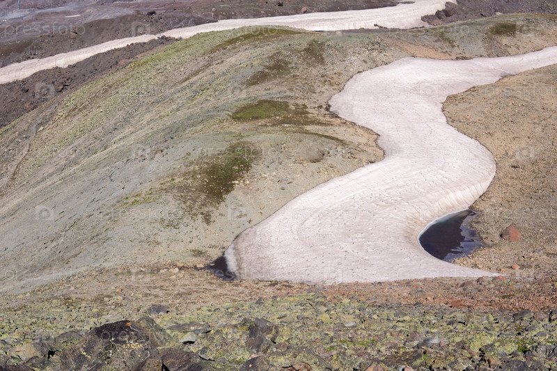Горный пейзаж, скалистое ложе тающего ледника с замерзшим талым озером