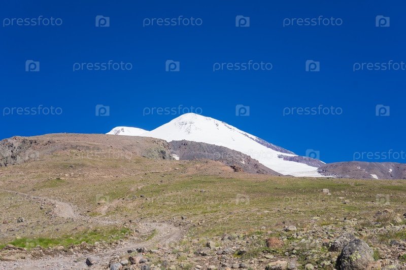 Вид на двойную вершину Эльбруса и стекающий с них в долину ледник