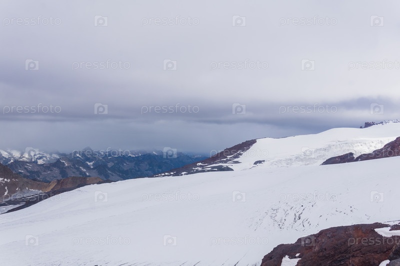 Вид на высокие горы над облаками с ледника на склоне Эльбруса