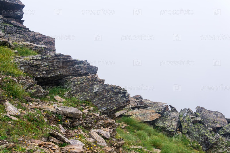 Горный пейзаж, скалы на склоне горы в густом тумане