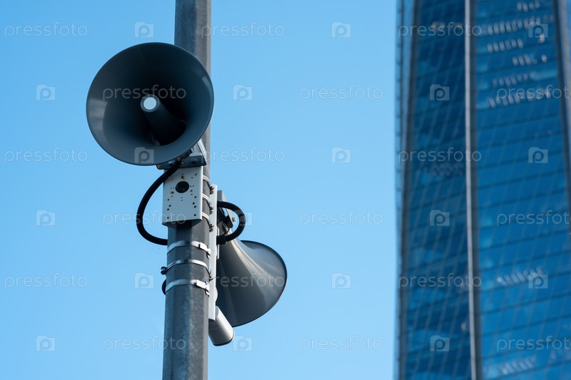 Уличные громкоговорители на столбе на фоне стеклянного фасада современного здания