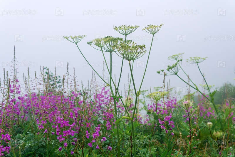 Альпийская луговая растительность на склоне горы внутри облака