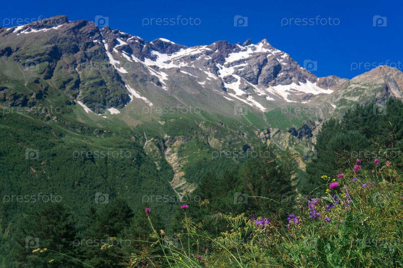 Размытый горный пейзаж со склоном и альпийскими лугами на переднем плане