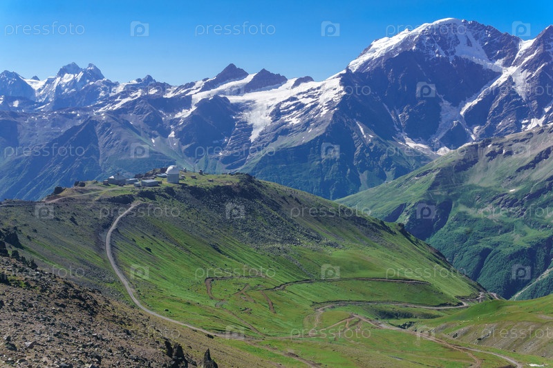 Панорамный горный пейзаж с зеленой высокогорной долиной, обсерваторией вдалеке и горными вершинами на заднем плане