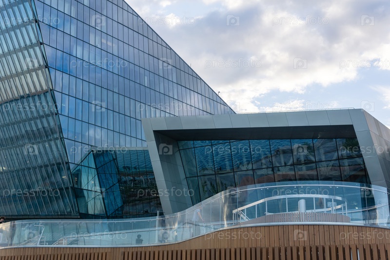 Современная архитектура, элементы фасада современного здания на фоне вечернего неба