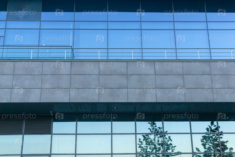 Современная архитектура, стеклянный фасадный элемент с отражением вечернего городского пейзажа