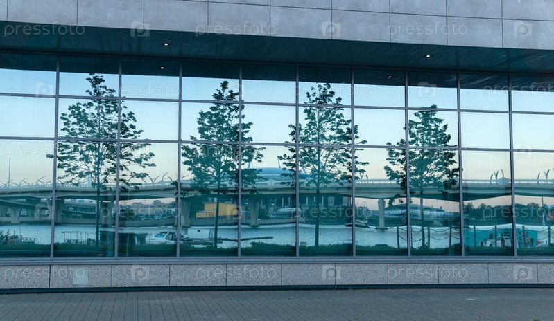 Современная архитектура, стеклянный фасадный элемент с отражением вечернего городского пейзажа