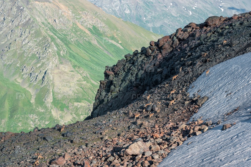 Высокогорный пейзаж со стадом диких горных козлов на переднем плане