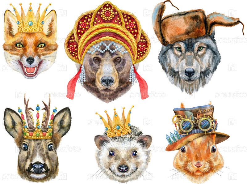 Акварельный рисунок животных - медведь, волк, лиса, косуля, еж и рыжая белка