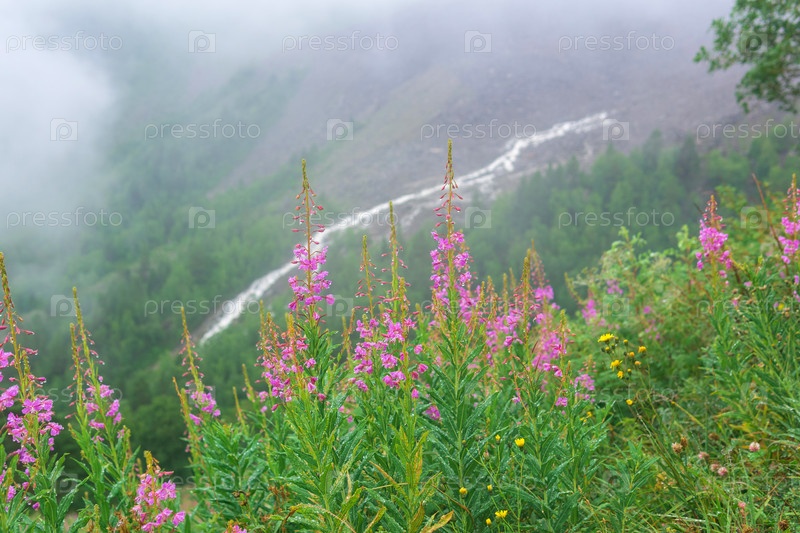 Кипрей на склоне горы внутри облака