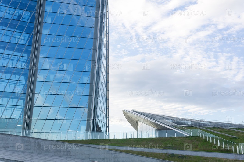 Современная архитектура, элементы фасада современных зданий на фоне неба