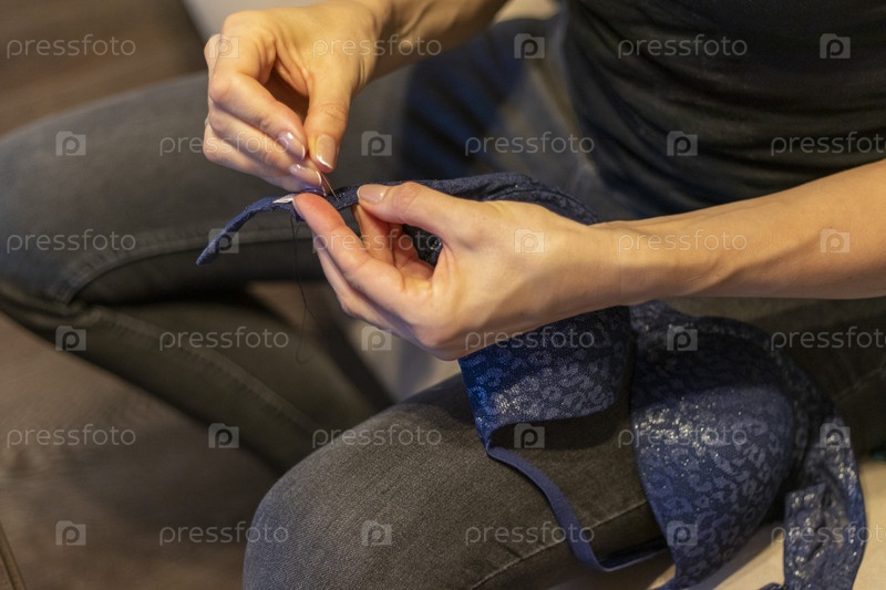 Снимок женщины с красивыми руками, которая шьет или сшивает нежную ткань для нижнего белья. Домашнее хозяйство