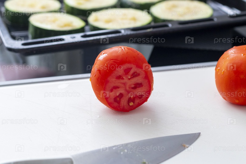 Кадр из цуккини на противне, помидоры, сыр, специи. Еда