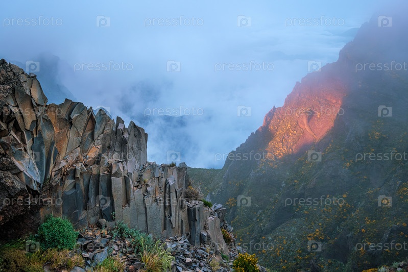 Горы на закате, покрытые туманом и облаками. Остров Мадейра, Португалия