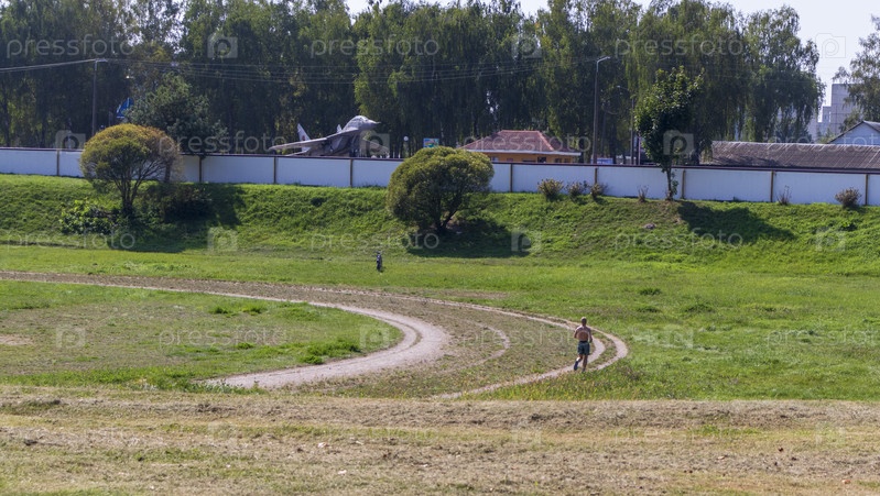 Мужчина бегает трусцой на открытом стадионе в городе. На заднем плане российский истребитель как памятник. Концепция