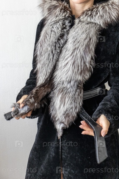 Снимок женщины в черном пальто из натурального меха. Мода