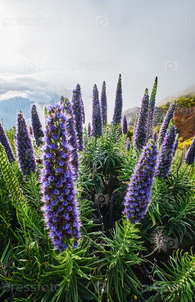 Пейзаж Мадейры с цветами Pride of Madeira и цветущими кустарниками Cytisus и горами в облаках