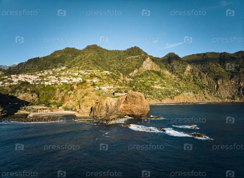 Вид с воздуха на скалы побережья Мадейры на восходе солнца, смотровая площадка Гиндасте, остров Мадейра, Португалия