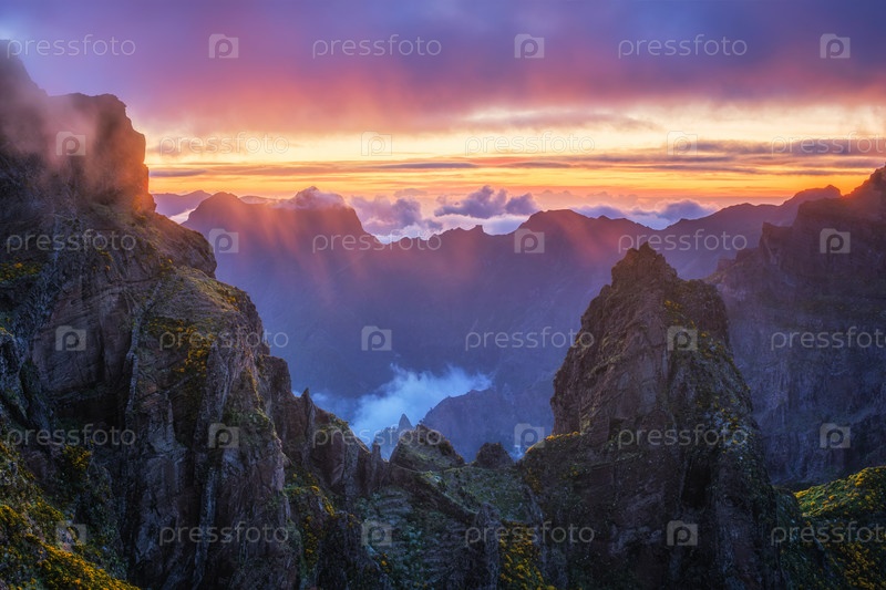 Горы на закате, покрытые туманом и облаками с цветущими кустарниками Cytisus. возле Пико-де-Арейро, остров Мадейра, Португалия