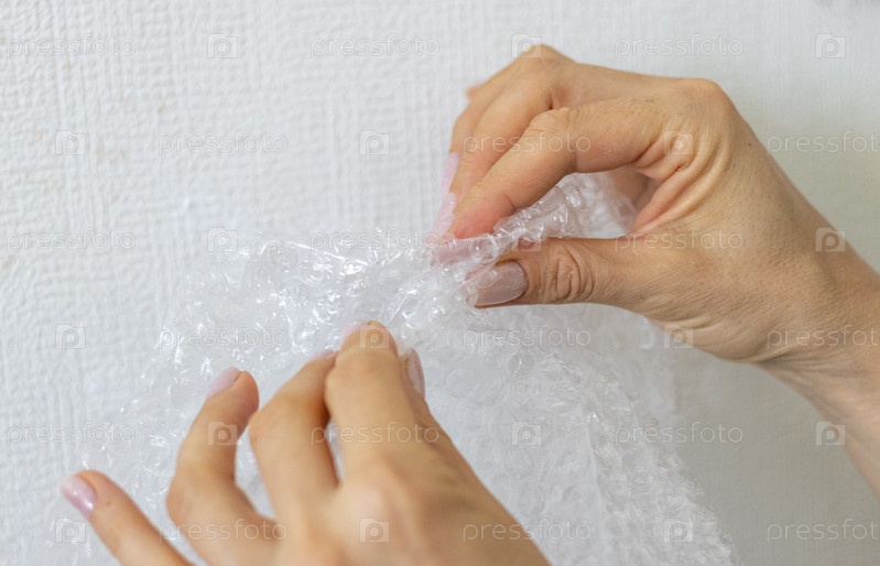 Снимок женщины, которая лопает пузырчатую пленку. Концепция