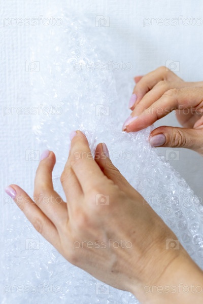 Снимок женщины, которая лопает пузырчатую пленку. Концепция