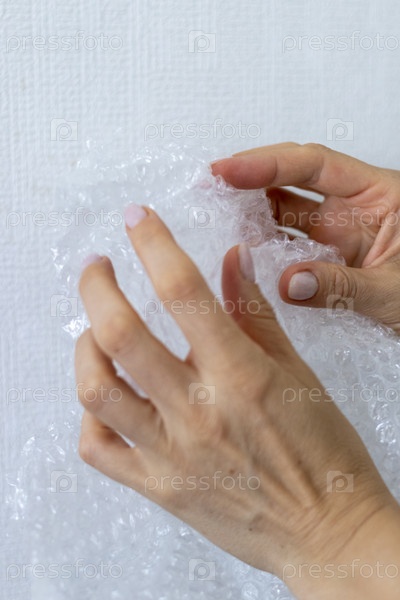 Снимок женщины, которая лопает пузырчатую пленку. Концепция