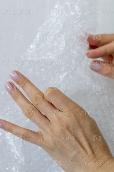 Снимок женщины, которая лопает пузырчатую пленку. Концепция