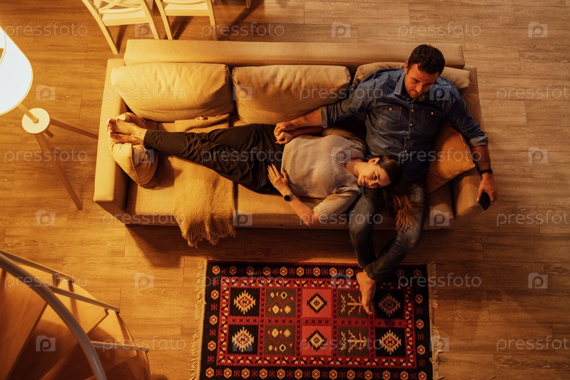 Молодая супружеская пара смотрит телевизор вечером. Счастливые муж и жена лежат на диване и отдыхают в гостиной
